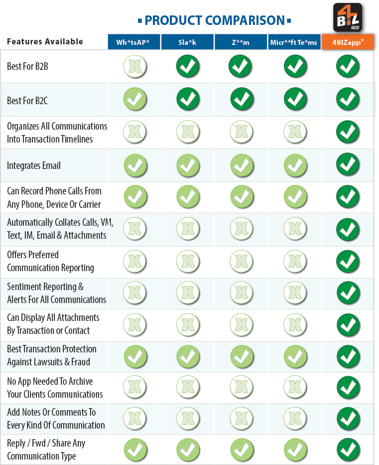 Your clients are generally only involved in one transaction at a time with one service provider, so linking their communications to transactions is simplified. Unlike service providers who are typically linked to a multitude of transactions. Thus, by using the 4BIZapp® to initiate calls and send texts, they are always linked to the correct transaction. Additionally, these functions just emulate the apps you normally use to make calls and texts, so there is no difference, inconvenience or any time lost. In fact time is saved by perforiming communicaitons from one location, as opposed to jumping from on app or device to another.